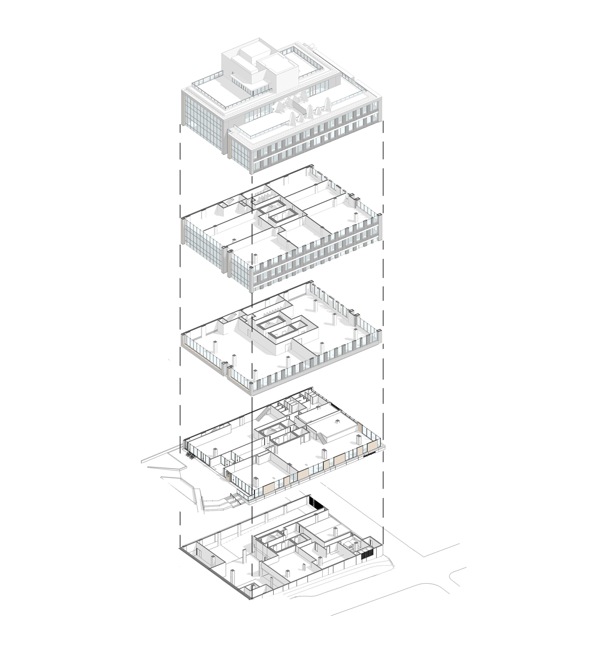 - Grade and the top floor are public-realm and user-oriented, with ample common spaces and landscaping. The ground level is set back from the street, with outdoor seating, retail space and on-site rainwater management