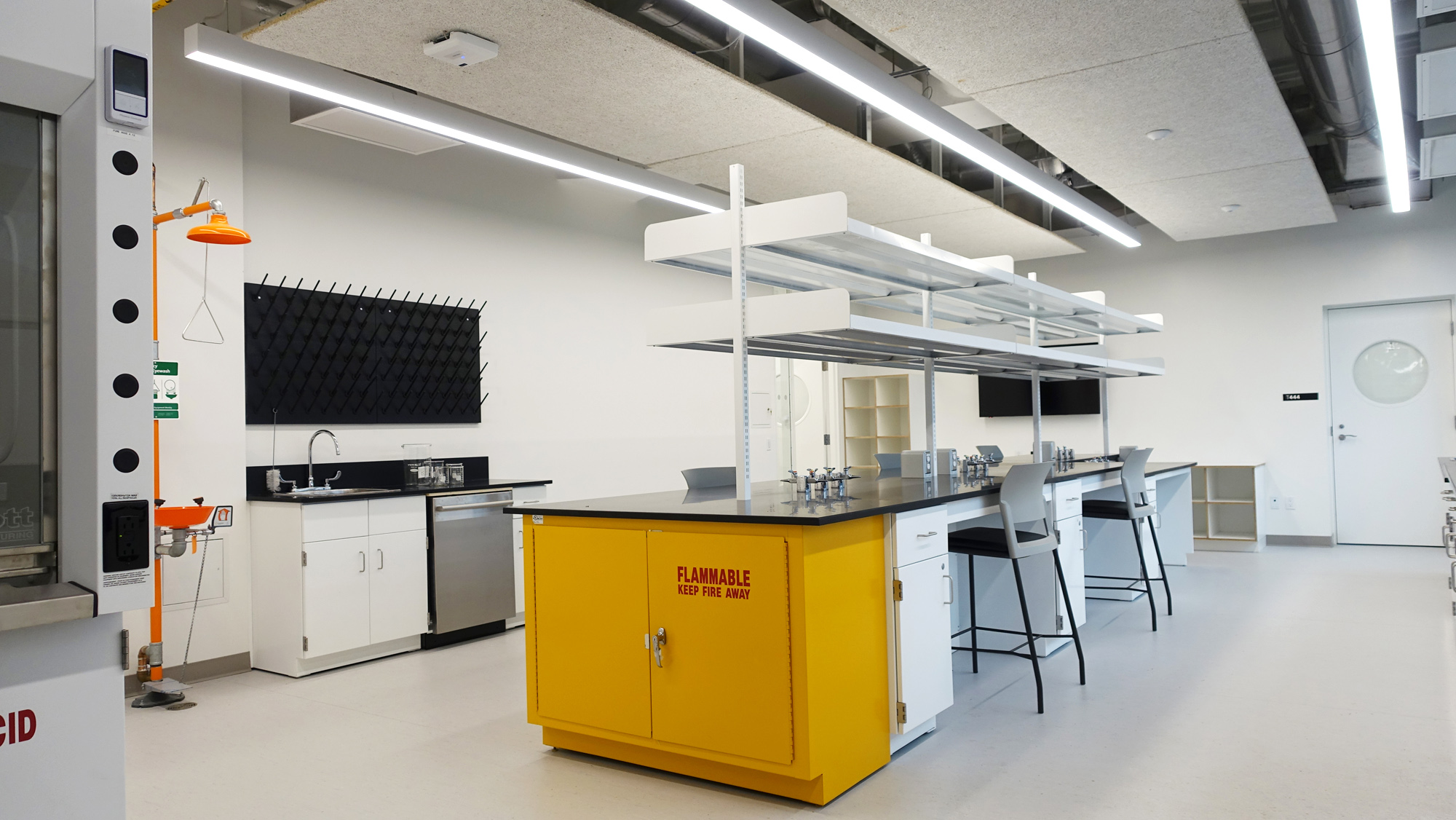 The main lab has all the essentials for an academic science lab geared towards teaching upper-level biology. Proscenium paired a clean contemporary design with the necessary specialized building services such as access to water, compressed air, fume hoods, filters and methods of disposing chemicals.