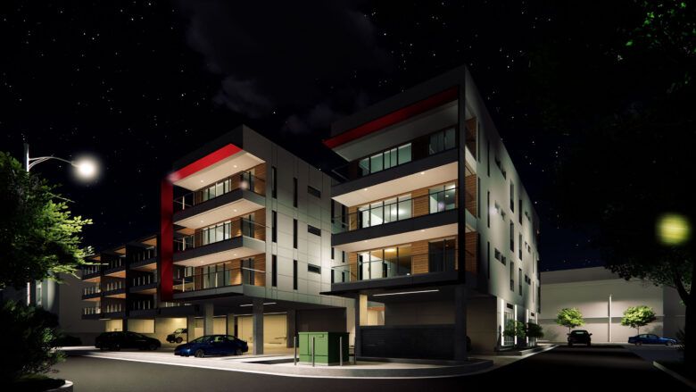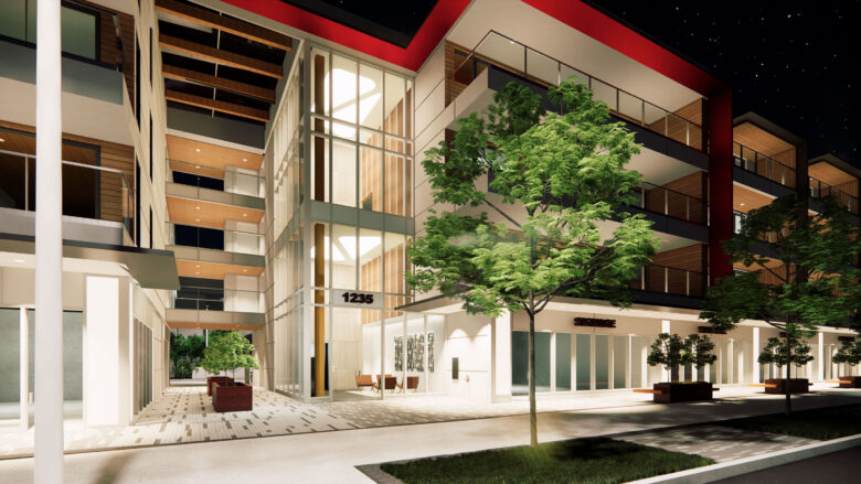 - Red metal frames to provide a bold accent and reflect the high energy of the busy thoroughfare through North Van