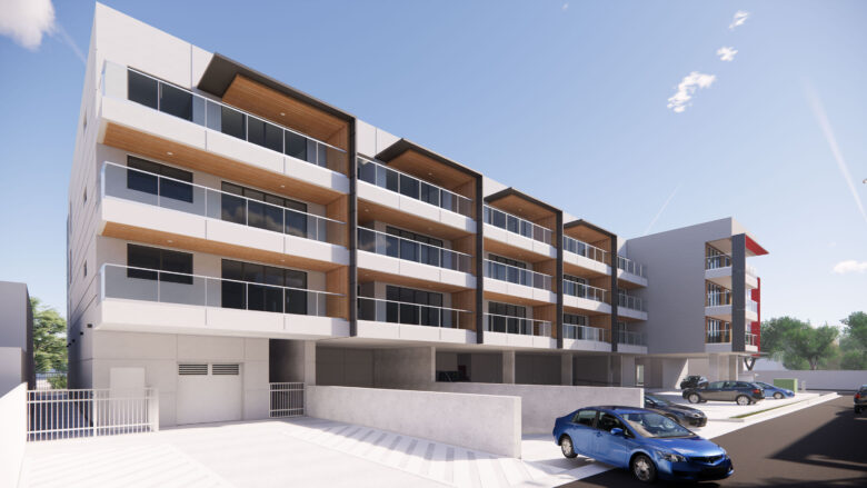 - Residential floors overhanging the commercial units for natural weather protection