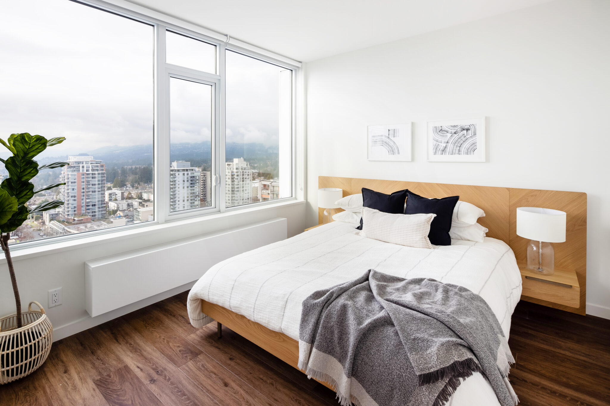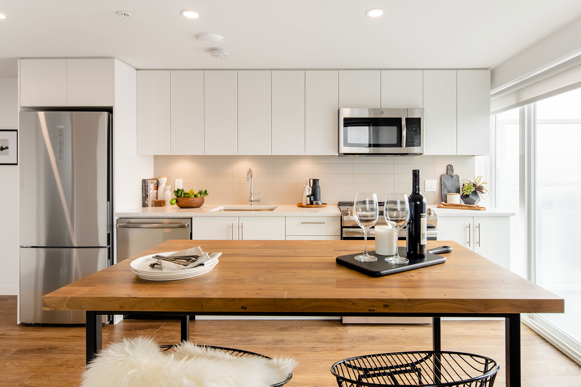 “Residents of both towers will be greeted by beautifully designed foyers and elevator lobbies with wood-slat feature walls and signature light fixtures. Inside the units, the interior design is soft and neutral, keeping the focus on the amazing views. The kitchens have elegant white cabinetry, chrome faucets, GE and Haier stainless-steel appliances and quartz-composite counters, which are echoed in the bathrooms. Warm-toned vinyl plank flooring throughout will complement anybody’s furniture, says Alissa Foss, interior designer at Proscenium Architecture + Interiors who designed the project. “We chose a design aesthetic with neutral tones that will suit all renters and allow them to bring their own style,” adds Foss.”