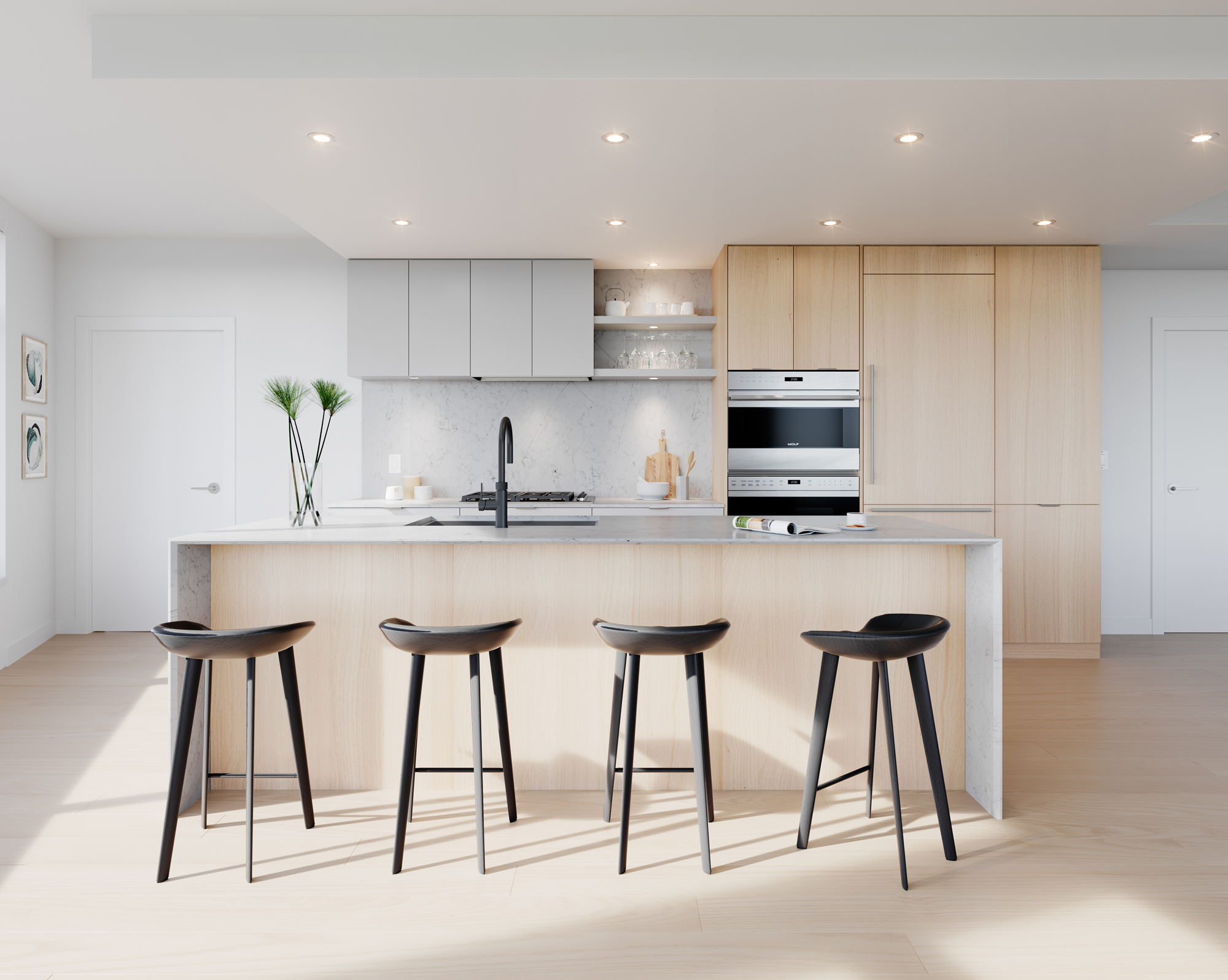 When architect Kori Chan of Proscenium Architecture and Interiors began working with his clients on designing their dream home, it was clear that the design of the space itself was far more important to them than flashy appliances or marble counters. So the budget went into creating an airy open-concept design, complete with 11-foot ceilings and Slung doors that open the room right out to the backyard. “When you have parties, people tend to congregate in the kitchen and eating area,” says Chan. “And here they can move up to the living room or outside to the porch, or outside to the grass—it’s really one big area.”