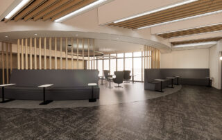 Thoughtful space planning maximizes natural light and allows for ample access to charging/USB outlets for personal electronics. Wood slats serve multiple functions, both practical and aesthetic—concealing mechanical elements, providing useful acoustic absorption and establishing a sense of linearity and cohesion in the overall design.