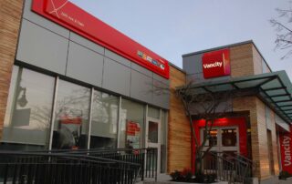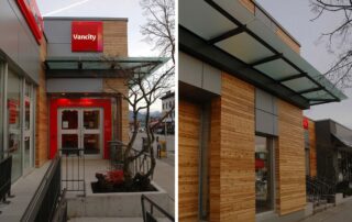 Located in the heart of the Main Street shopping corridor, the Vancity branch at 26th Avenue was in need of updating in terms of visibility, building envelope, and accessibility. Proscenium used the re-cladding of the building as an opportunity to give Vancity a commercial presence at the corner while introducing a visually-appealing and sophisticated design language.