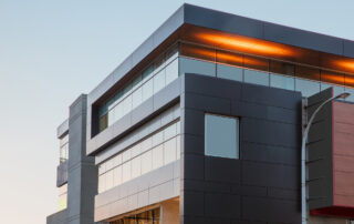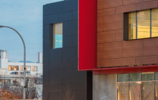 The three-storey building is wrapped by a curtain wall of architectural concrete and wood-look metal panels, creating a warm and inviting exterior. A vibrant red canopy provides weather protection for pedestrians. The “sliding planes” of the building, with its intersecting horizontal and vertical lines, adds visual intrigue to the busy corner in Vancouver’s Kitsilano neighbourhood.
